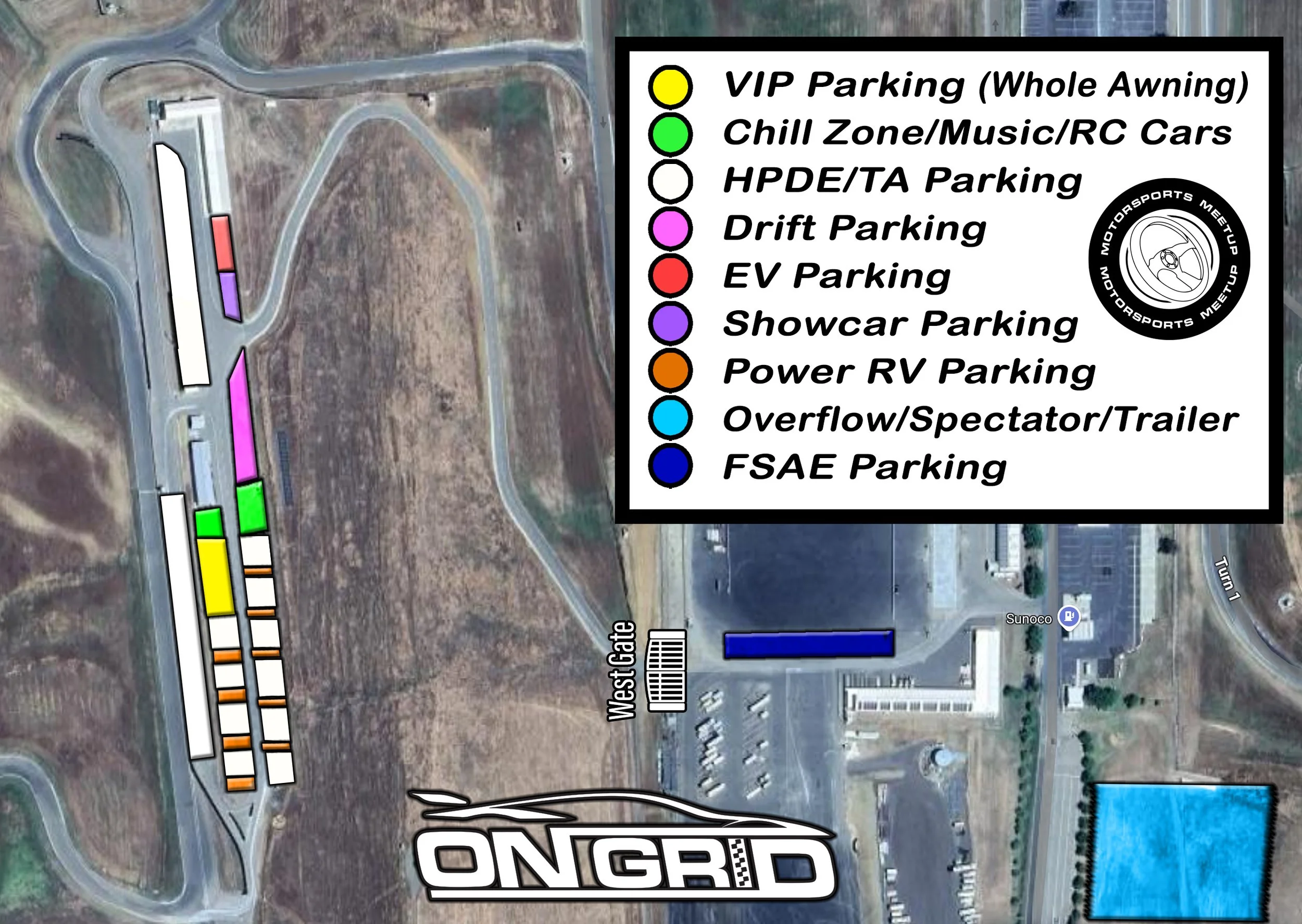 If your friends/family are coming to spectate/support, they are required to park in General Parking. You can drive your track car over the hill to pick them up, or they can walk over the hill into the event. If space is needed for drivers or vendors, we will ask you to relocate to overflow parking.